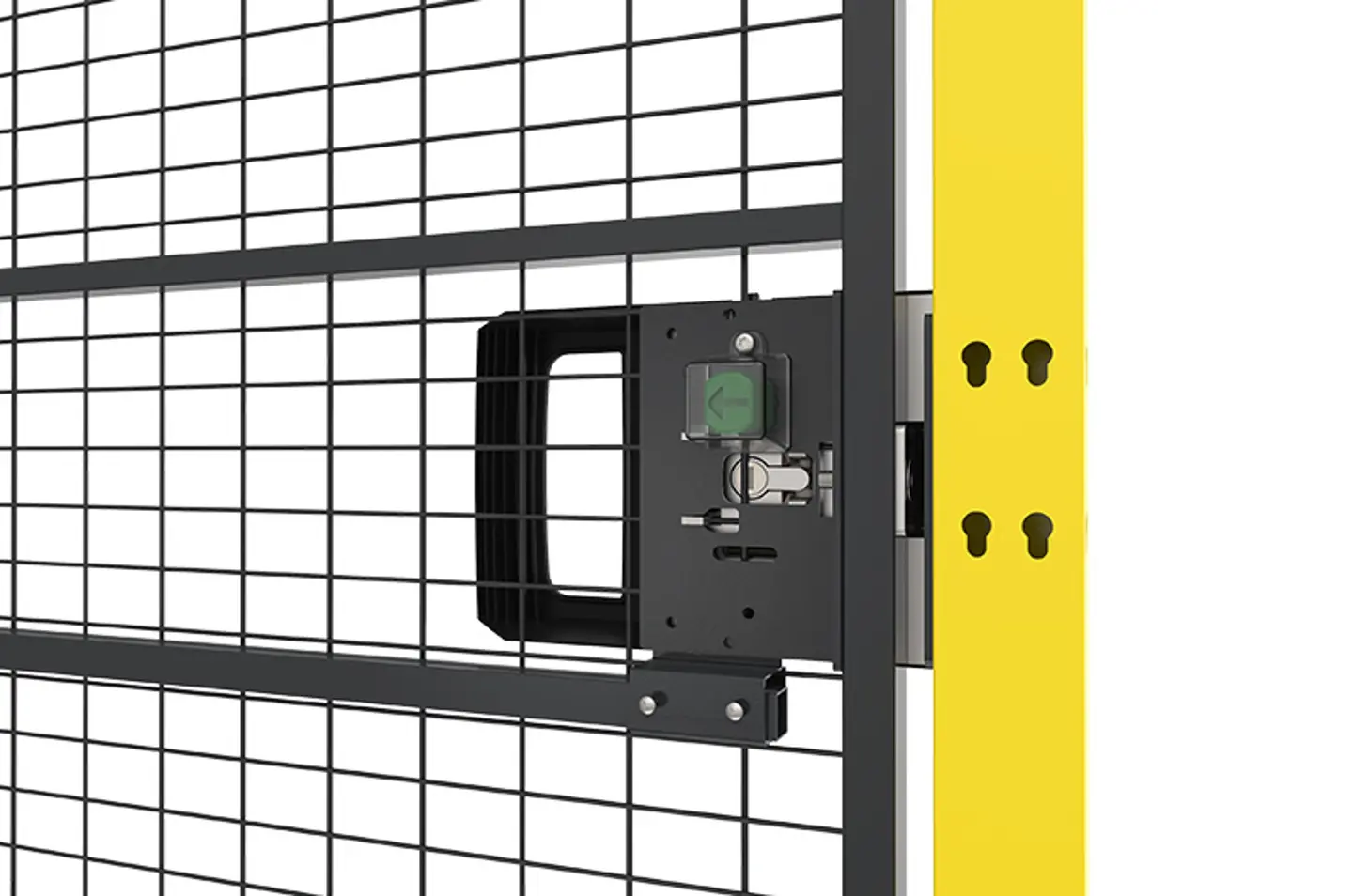 The C-type standard for these systems (EN 528) requires that doors in the perimeter guarding (fencing) must open outwards and can always be opened from the inside without a key. From the outside, opening is allowed with a key only (section 4.10.4.2).  Axelent’s X-It lock and the quite new X-It Electric are both available with escape release and are thus generally suitable for such applications. However, an additional proximity switch will be needed to communicate the status of the door to the control system’s safety circuit.